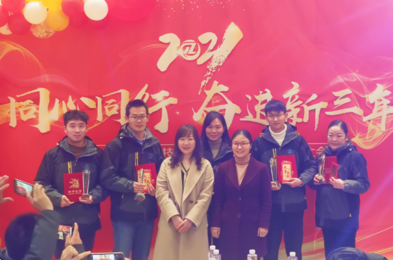 总经理王荻和副总经理戴海霞为年度优秀员工颁奖并合影
