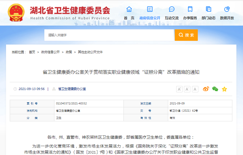湖北省卫健委于2021年9月9日发布《省卫生健康委办公室关于贯彻落实职业健康领域“证照分离”改革措施的通知》鄂卫办通〔2021〕62号